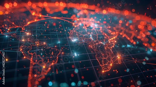 Futuristic global network with vibrant red connections highlighting world map, representing digital communication and data exchange.