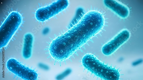 Futuristic Glowing Bacteria Floating in Liquid on White Background