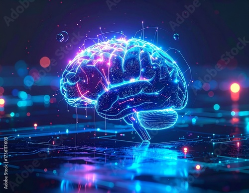 futuristic glowing human brain connected with holographic circuits