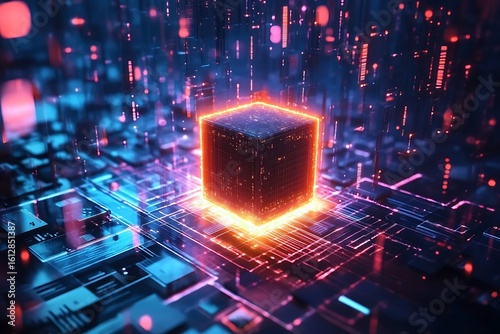 Futuristic Glowing Microchip with Digital Data Streams Representing Advanced Computing and High-Tech Electronics Innovation