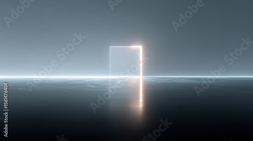 Futuristic glowing rectangular doorway opening to a mysterious illuminated horizon scene.
