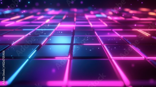 Futuristic grid of glowing neon squares and lines, fading into a dark background.