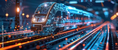 Futuristic hologram train on circuit board with glowing neon light. generative AI image