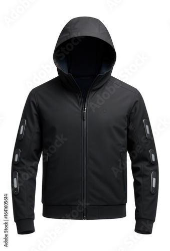 Futuristic hooded jacket with integrated biometric sensors along the sleeves