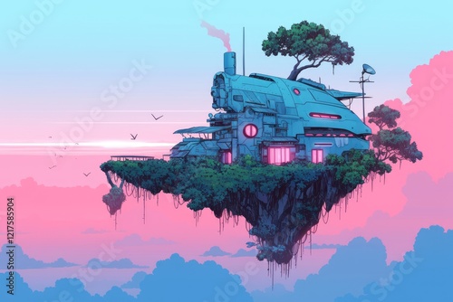 Futuristic House on a Floating Island in Pastel Sky