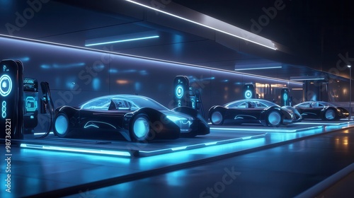 futuristic hydrogen fuel station with sleek design featuring holographic fuel gauges and a queue of nextgen hydrogenpowered vehicles