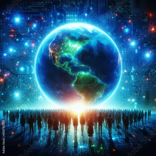 Futuristic image depicting a glowing Earth superimposed on a circuit board background with a crowd of silhouettes approaching, symbolizing global connectivity.. AI Generation