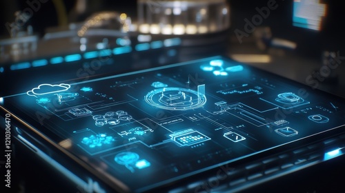 Futuristic interactive screen featuring cloud computing, data analysis, and various tech icons, illustrating the integration of digital information and advanced analytics