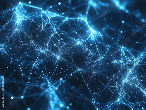 Futuristic low-poly geometric abstract design with blue wireframe and glowing orange network connections