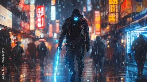 Futuristic Mecha Samurai Overlooking Neon City: Anime Art