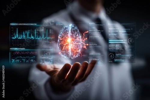 Futuristic medical technology visualizing a digital heart with holographic data display for healthcare innovation and cardiovascular research
