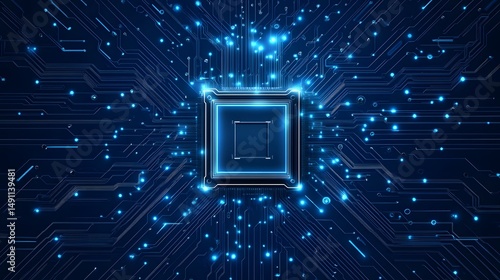 Futuristic Microchip on a High-Tech Blue Circuit Board, Representing Advanced Computing Technology and Digital Innovation in Modern Electronics.