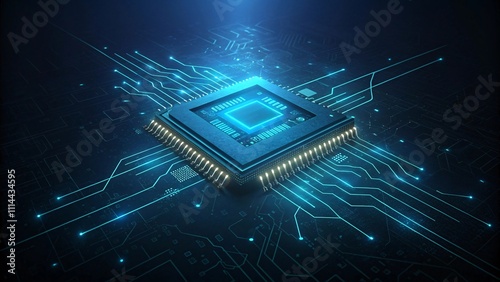 Futuristic Microchip with Glowing Connections in Digital Landscape V1