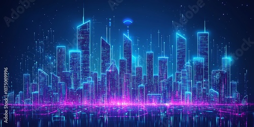 Futuristic neon cityscape with glowing digital buildings and a network connection.