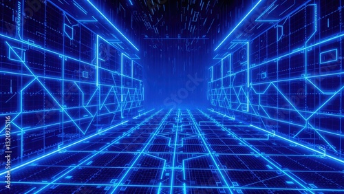Futuristic Neon Corridor with Bright Blue Lines and Grid Pattern