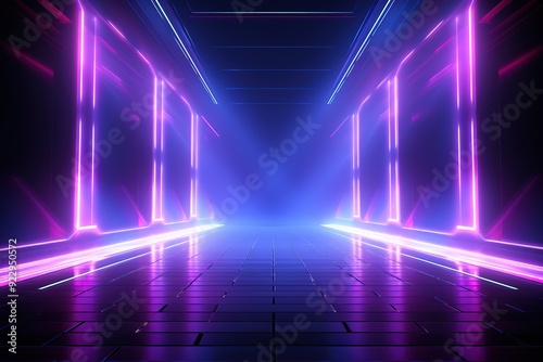 Futuristic neon corridor with glowing lines and tiled floor.