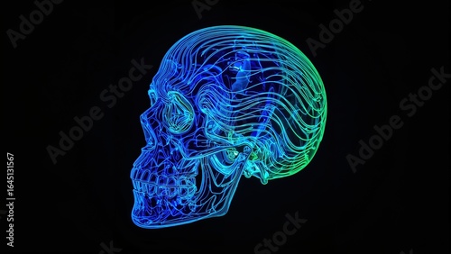 Futuristic neon human skull wireframe anatomy in blue and green light on black background for science and technology concepts