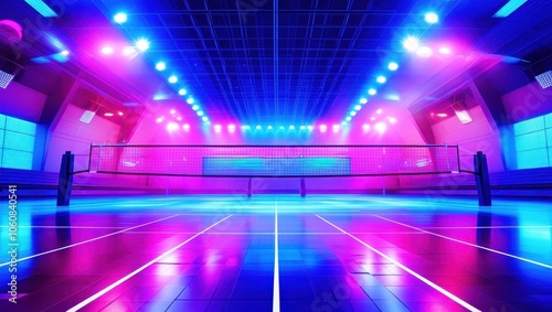 Futuristic neon tunnel, vibrant purple and blue lighting, symmetrical perspective, reflective floor, sci-fi aesthetic, cyberpunk corridor, glowing LED strips, high-tech architecture, sleek metallic su