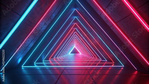Futuristic neon-glowing triangular motion lines background with dynamic blue, red, and pink neon lights, creating a vibrant, high-tech, and digital abstract aesthetic