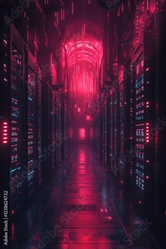 Futuristic Neon-Lit Data Center Corridor with Rows of Servers and Glowing Red and Blue Lights