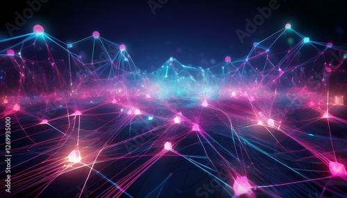futuristic network connections with pink and blue glowing nodes for data transfer encryption and neural networks