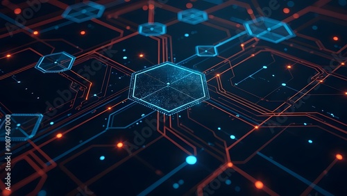 Futuristic network visualization with hexagonal shapes and glowing connections symbolizing data flow