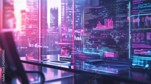 Futuristic office with holographic displays showing data, graphs, and city skyline.
