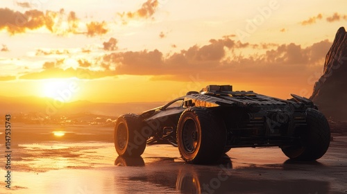 Futuristic off-road vehicle parked on a desert landscape at sunset.