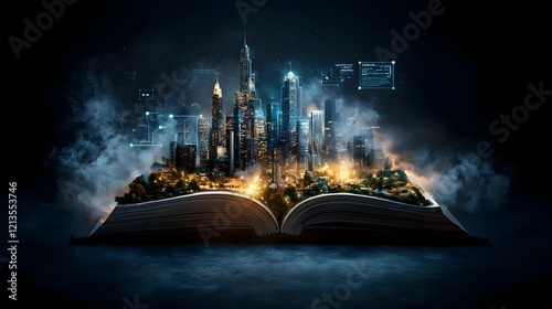 Futuristic open book glowing with vibrant light showcasing an advanced construction site of the future with autonomous robots 3D printing of buildings and eco friendly materials