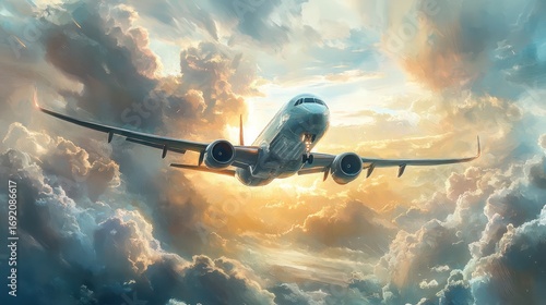Futuristic planes powered by graphene hybrid batteries, dramatic take-off scene, vivid clouds