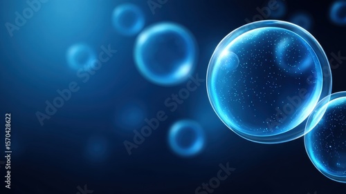 Futuristic quantum model. Abstract blue bubbles with glowing highlights in a dark background.