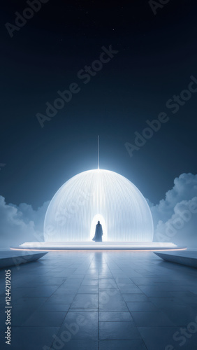 Futuristic religious space sanctuary with a lone figure approaching an illuminated dome.
