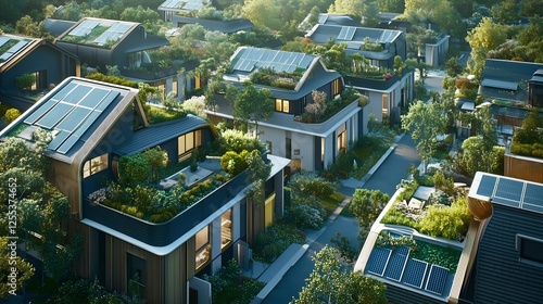 Futuristic residential neighborhood with modern homes are seamlessly integrated with nature, Solar panels are installed on the rooftops, renewable energy and sustainable living concept