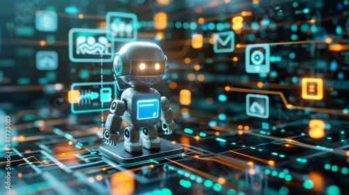Futuristic robot in a digital world, surrounded by glowing icons and circuit patterns, representing advanced technology and AI integration.