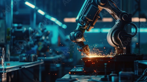 Futuristic robot metal welding with professional equipment in modern workshop, AI generated image