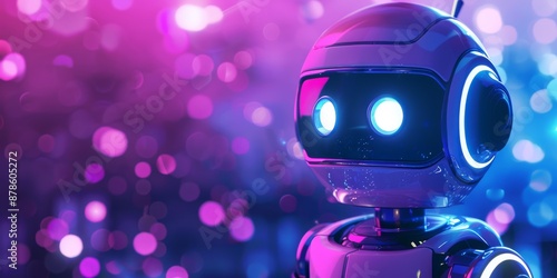 Futuristic robot with glowing eyes and neon lights in abstract background, symbolizing innovation and technology