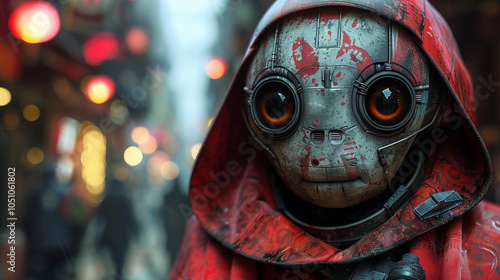 Futuristic robot with red hood standing in vibrant, blurred urban street with neon lights