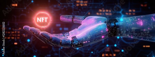 Futuristic Robotic Hand Holding NFT Symbol in Cyberpunk Style Digital Interface and Geometric Patterns