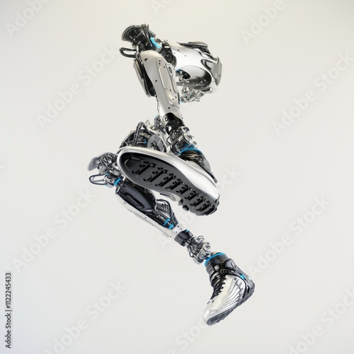 Futuristic robotic leg in dynamic running pose showcasing advanced technology and innovation against a minimalist light background for conceptual imagery