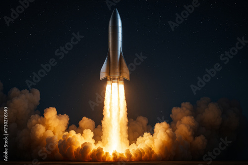 Futuristic rocket launching with flames and smoke against starry night sky