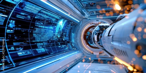 Futuristic sci-fi corridor with advanced technology, glowing displays, and intricate machinery creating a captivating space exploration environment