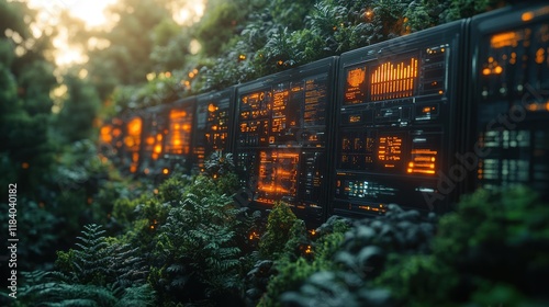 Futuristic screens in jungle; data, sunset, nature, tech