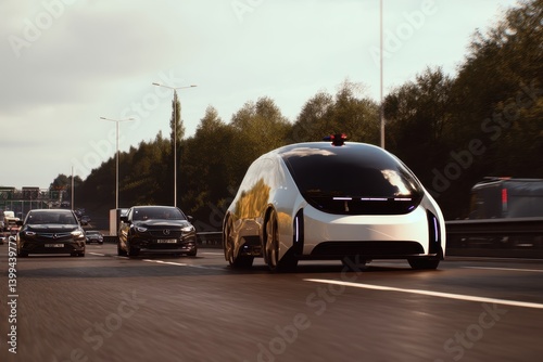 Futuristic self-driving car leads highway traffic, showcasing advanced technology.