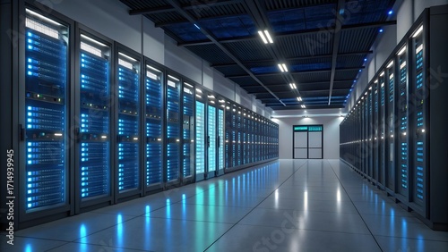 Futuristic Server Room with Glowing LED Racks – Data Center Concept