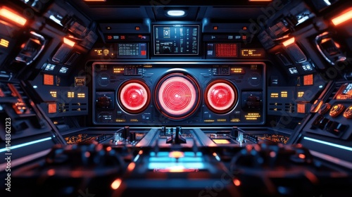 Futuristic spaceship bridge interior with glowing controls and displays.