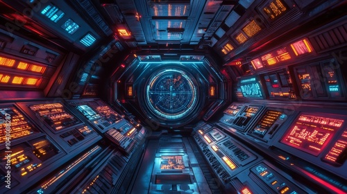 Futuristic spaceship interior with high-tech control panels and a central radar display in neon blue and red lighting