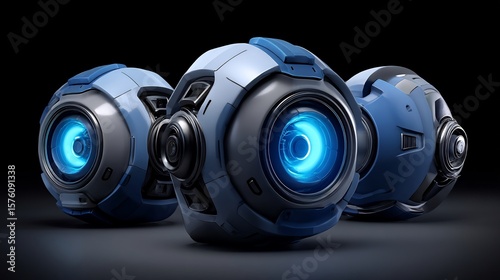 Futuristic Spherical Drones with Glowing Blue Lenses on Black Background with Shadow