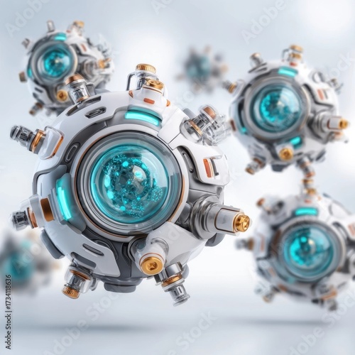 Futuristic spherical robots with glowing blue cores and metallic components hover in a sleek, high-tech environment.