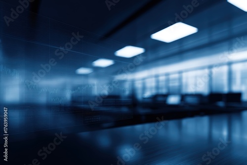 futuristic stock market trading room with digital overlays and blue tones
