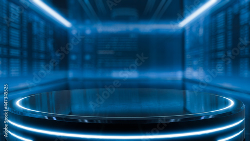 Futuristic table pedestal for display with illuminated light. Blank Glossy podium for product. Stage and sci-fi concepts. 3d illustration.